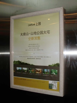 电梯镜框1.0:安装于东方名苑电梯内,标准尺寸的平面看板,内径:450mm×600mm,高档精致画框,高象素平面制作画面,无画面切换,广告停留时间长