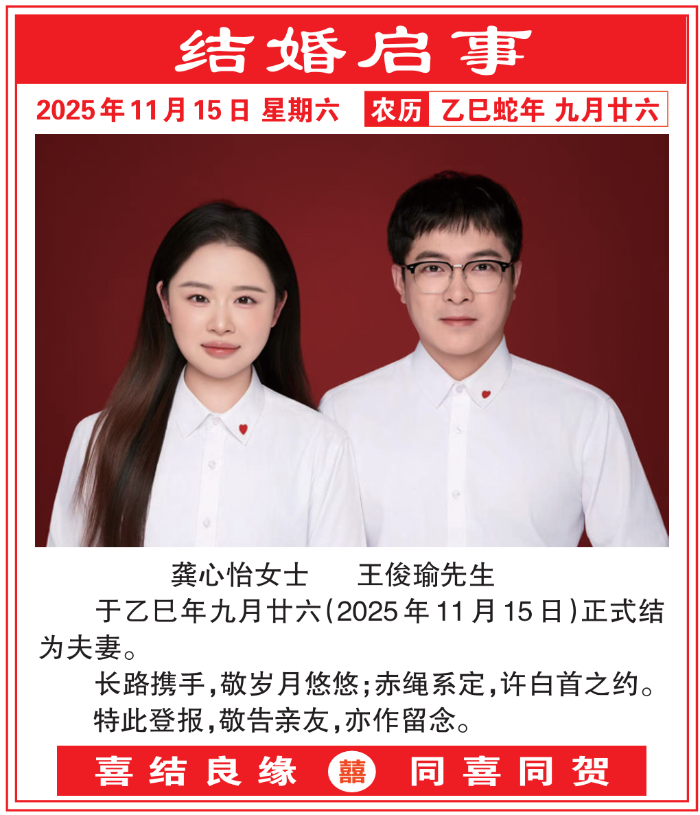 - 11-15· 龚心怡女士王俊瑜先生扬子晚报登报结婚启事...