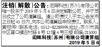 闳晖科技(苏州)有限公司唯一股东于2019年5月6日决定解散公司,并于同日成立了公司清算组。请公司债权人于本公告发布之日起45日内,向本公司清算组申报债权。联系人:黄冠伟 联系电话: 0512-8228闳晖科技注销江苏商报登报(解散)公告99闳晖科技注销江苏商报登报(解散)公告99,地址:苏州市吴中区胥口镇古村路8号12幢4号三楼 邮编:2150闳晖科技注销江苏商报登报(解散)公告00闳晖科技(苏州)有限公司清算组2019年5月6日