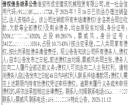 - · 成宏建筑机械租赁扬子晚报登报债权...